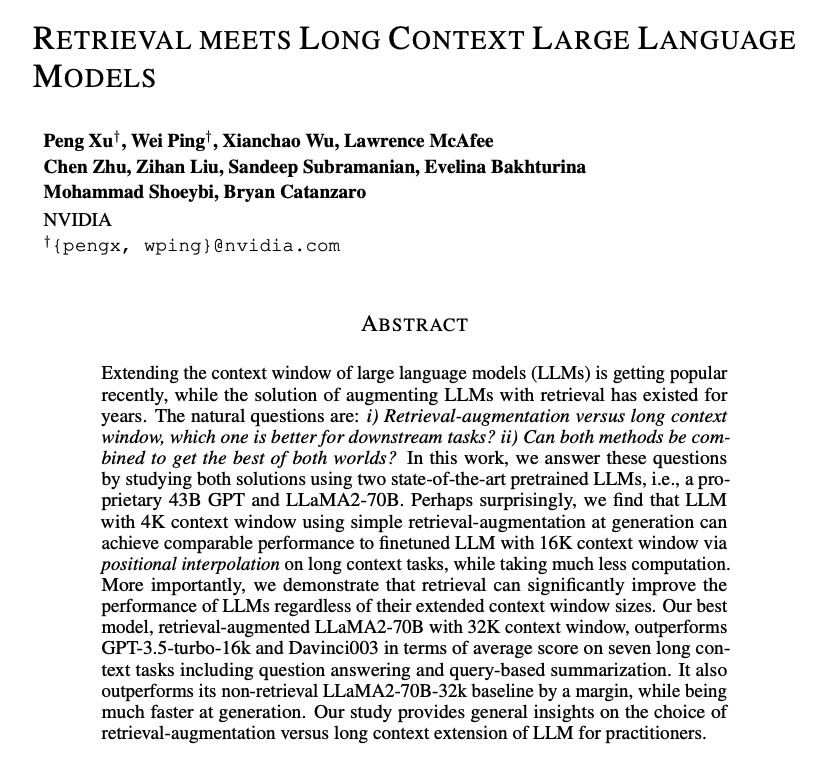 Compares retrieval augmentation and long-context windows for downstream tasks to investigate if the methods can be combined to get the best of both worlds; an llm with a 4k context window using simple rag can achieve comparable performance to a fine-tuned llm with 16k context; retrieval can significantly improve the performance of llms regardless of their extended context window sizes; a retrieval-augmented llama2-70b with a 32k context window outperforms gpt-3.5-turbo-16k on seven long context tasks including question answering and query-based summarization.