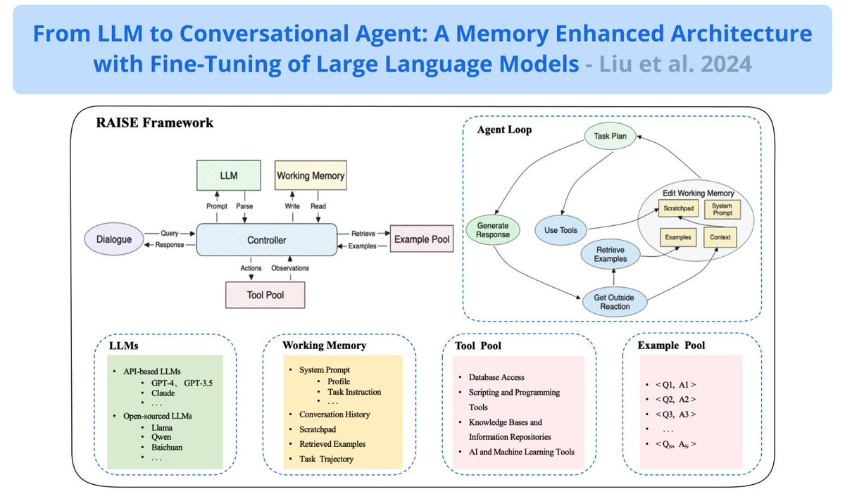 - 대화형 에이전트를 위한 LLM을 강화하기 위한 고급 아키텍처인 RAISE 제안합니다. 이 아키텍처는 리액트 프레임워크에서 영감을 받아 이중 구성 요소 메모리 시스템을 통합하고, 스크래치패드와 검색된 예제를 활용하여 에이전트의 기능을 강화합니다. 스크래치패드는 단기 메모리와 유사한 임시 저장소 역할을 하고 검색 모듈은 에이전트의 장기 메모리로 작동하며, 이 시스템은 인간의 단기 및 장기 기억을 반영하고 대화형 시스템에서 핵심인 맥락과 연속성을 유지하는 데 도움이 됩니다.