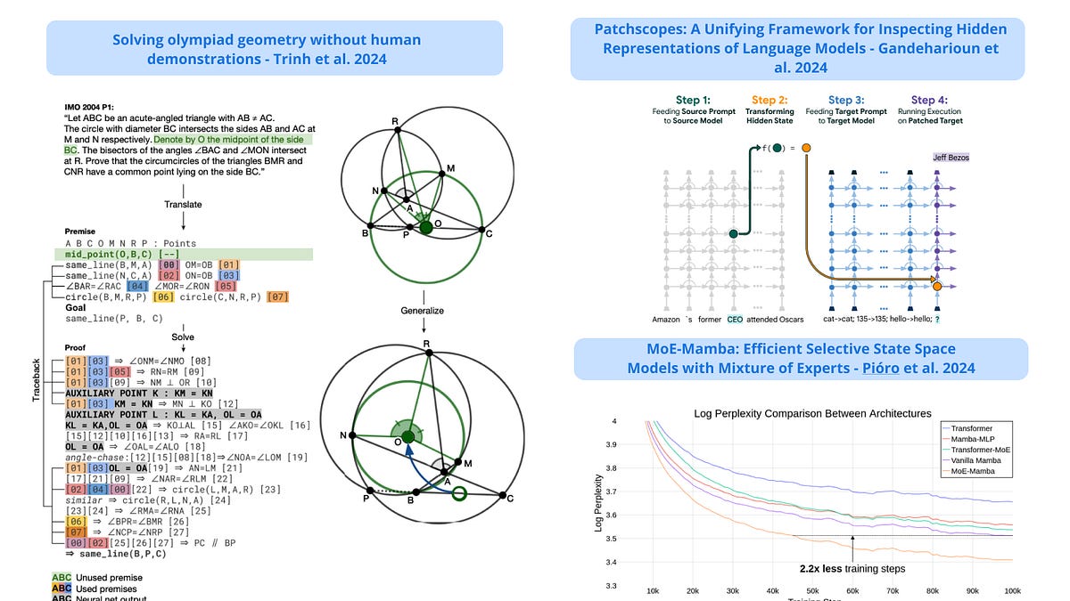 "AlphaGeometry", "Reasoning with Reinforced Fine-Tuning" 그리고 "MoE-Mamba" 등의 논문들은 강화 학습과 이를 이용한 추론 능력에 대한 연구임을 시사합니다. 강화 학습을 통해 모델이 보다 정교한 결정을 내릴 수 있게 함으로써, 인공지능의 추론과 학습 능력을 높이려는 시도로 볼 수 있습니다. 또한 다양한 분야에 특수화된 모델들이 등장하는 것은, AI 기술이 특정 분야의 정보를 처리하고 이해하는 데 있어 효과적으로 적용될 수 있는 방향으로 발전하고 있음을 나타냅니다.