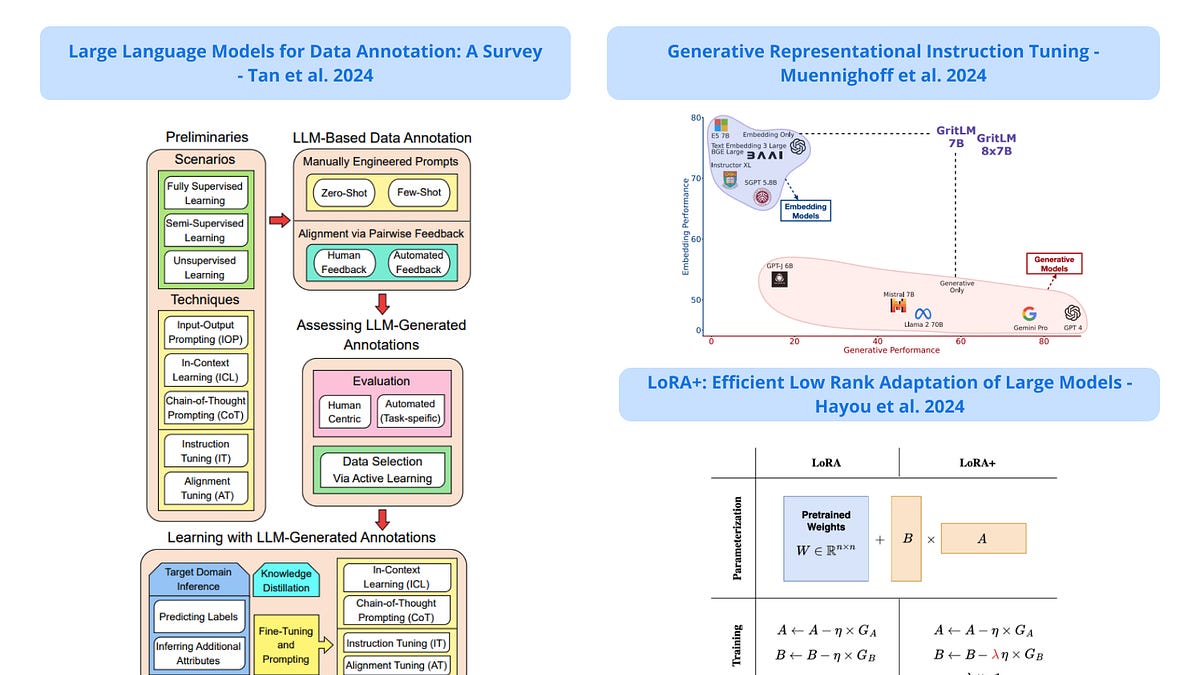 이번 주에 선정된 논문들은 대체로 '대규모 언어 모델(Large Language Models, LLM)' 및 '강화 학습(Reinforcement Learning, RL) 기반 알고리즘'에 초점을 맞춘 것으로 보입니다. 'Stable Diffusion 3', 'Gemma', 'LLMs for Data Annotation', 'Revisiting REINFORCE in RLHF', 'When is Tree Search Useful for LLM Planning', 'CoT Reasoning without Prompting' 등의 논문들은 언어 모델의 파생 기술과 성능 향상에 관한 주제로 특히 LLM의 활용 가능성과 효과적인 사용 방법에 대한 연구가 많은 것을 볼 수 있습니다. 게다가 'GRIT', 'LoRA+', 'Recurrent Memory Finds What LLMs Miss' 논문들은 언어 모델과 관련된 기존의 접근 방식을 재검토하거나, 기존 기법들을 보완하는 새로운 알고리즘을 통한 성능 개선에 대해 다루고 있어 이 분야의 지속적인 발전과 관심을 반영하고 있습니다.