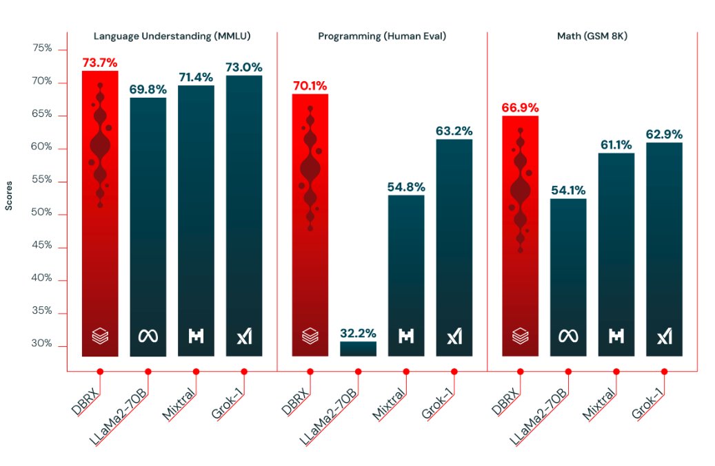 A new 132B parameter open LLM that outperforms all the established open-source models on common benchmarks like MMLU and GSM8K; DBRX was pretrained on 12T tokens (text and code) and uses a mixture-of-experts (MoE) architecture; its inference is up to 2x faster than LLaMA2-70B and is about 40% of the size of Grok-1 in terms of both total and active parameter counts; there is also DBRX Instruct which demonstrates good performance in programming and mathematics; while DBRX is trained as a general-purpose LLM, it still surpasses CodeLLaMa-70 Instruct, a model built explicitly for code generation.