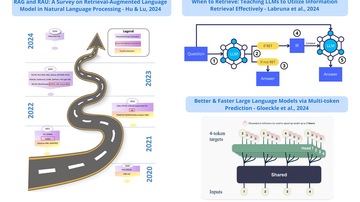 이러한 경향은 최근 인공지능 분야에서 언어 모델의 발전이 매우 중요한 연구 주제로 자리잡고 있음을 반영합니다. 특히, GPT-3와 같은 대규모 언어 모델의 등장 이후, 연구자들은 이러한 모델을 어떻게 더 효율적으로 학습시키고, 정확도를 높이며, 다양한 도메인이나 상황에 적용할 수 있는지에 대해 다양한 방법을 모색하고 있습니다. 검색-증강 기법의 연구는 이러한 모델들이 더 넓은 범위의 정보를 활용하여 답변을 생성할 수 있게 해주며, 다중-토큰 예측과 같은 기법은 모델의 학습 효율성과 성능 향상에 기여할 수 있습니다. 또한, 멀티모달 접근법은 단순히 텍스트 데이터만 아니라, 이미지, 사운드 등 다른 유형의 데이터와의 결합을 통해 언어 모델을 더욱 풍부하게 만들 수 있는 가능성을 탐색합니다.