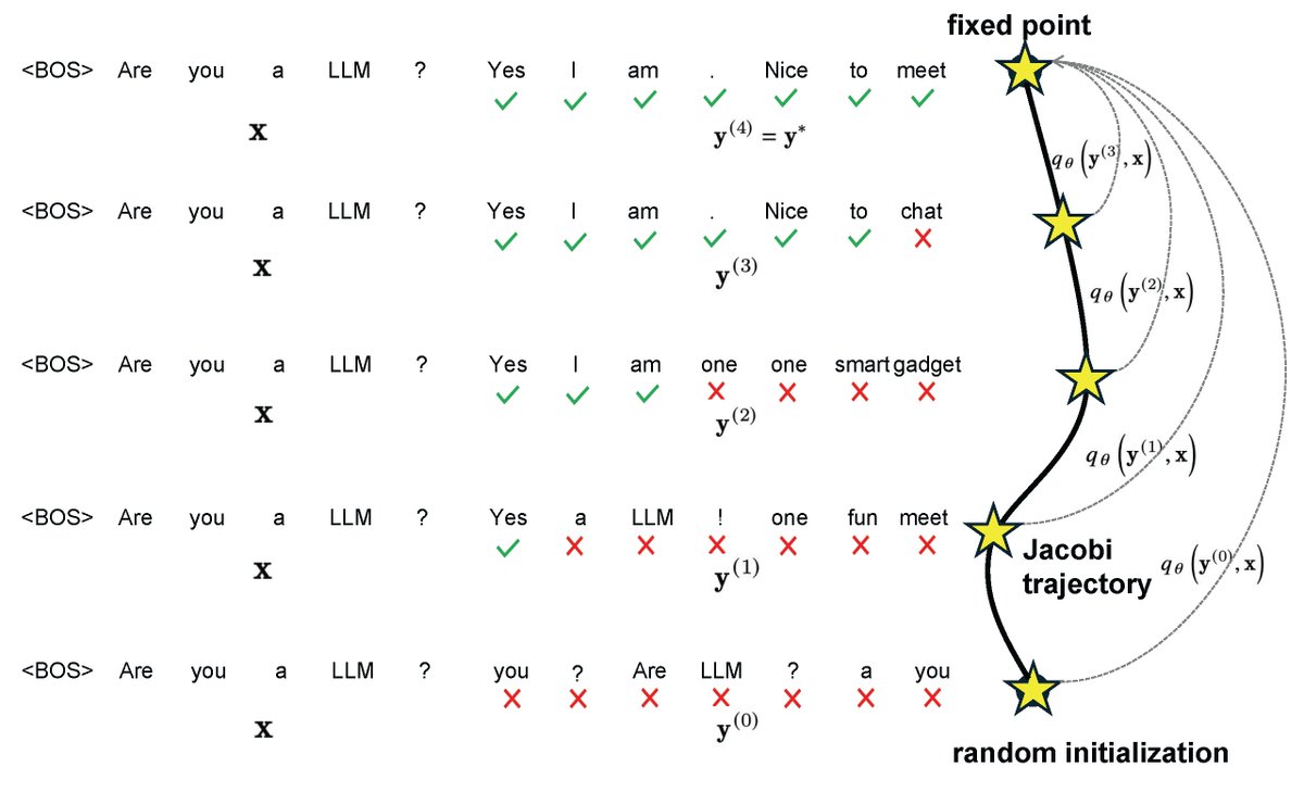 Jacobi 디코딩과 같은 병렬 디코딩 방법은 LLM 디코딩 프로세스의 순차적 특성을 깨고 병렬화 가능한 계산으로 변환하기 때문에 보다 효율적인 LLM 추론에 대한 가능성을 보여줍니다. 그러나 실제로는 기존의 자동 회귀(AR) 디코딩에 비해 속도가 거의 향상되지 않는데, 이는 Jacobi 디코딩이 단일 고정점 반복 단계에서 하나 이상의 토큰을 정확하게 예측하는 경우가 드물기 때문입니다. 이 문제를 해결하기 위해 저희는 모든 상태에서 Jacobi 궤적의 고정점까지 빠른 수렴을 실현하는 새로운 접근 방식을 개발했습니다. 이는 모든 상태를 입력으로 주어졌을 때 일관되게 고정점을 예측하도록 목표 LLM을 개선함으로써 달성됩니다. 광범위한 실험을 통해 도메인별 벤치마크와 오픈 도메인 벤치마크 모두에서 생성 품질을 유지하면서 생성 속도가 2.4배에서 3.4배 향상된 것으로 나타나 이 방법의 효과가 입증되었습니다.