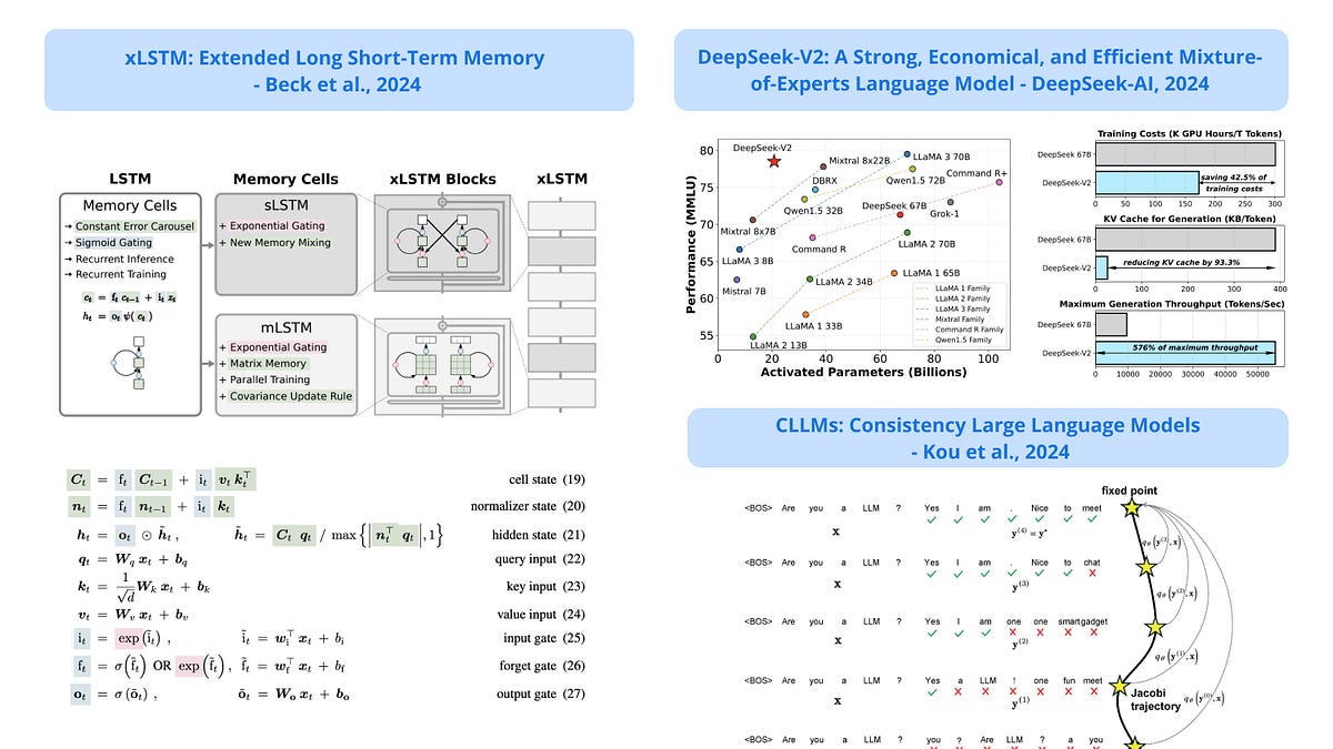 이번 주 선정된 논문들을 살펴보면, 두 가지 주요 경향이 나타납니다. 첫 번째로는 자연어 처리(NLP)와 관련된 연구가 다수 포함되어 있습니다. 예를 들어, "Is Flash Attention Stable?"와 "Consistency LLMs"는 모두 최근 NLP 분야에서 중요한 주제인 언어 모델의 성능과 안정성에 초점을 맞춘 연구입니다. 두 번째로, 알고리즘 개선 및 새로운 프레임워크 개발에 관한 연구도 두드러집니다. "xLSTM", "AlphaFold 3", "DeepSeek-V2"와 같은 논문들은 기존 모델과 알고리즘을 넘어서 새롭게 발전시키려는 시도를 보여줍니다.