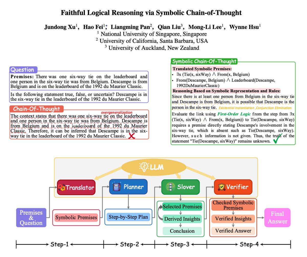 While the recent Chain-of-Thought (CoT) technique enhances the reasoning ability of large language models (LLMs) with the theory of mind, it might still struggle in handling logical reasoning that relies much on symbolic expressions and rigid deducing rules. To strengthen the logical reasoning capability of LLMs, we propose a novel Symbolic Chain-of-Thought, namely SymbCoT, a fully LLM-based framework that integrates symbolic expressions and logic rules with CoT prompting. Technically, building upon an LLM, SymbCoT 1) first translates the natural language context into the symbolic format, and then 2) derives a step-by-step plan to solve the problem with symbolic logical rules, 3) followed by a verifier to check the translation and reasoning chain. Via thorough evaluations on 5 standard datasets with both First-Order Logic and Constraint Optimization symbolic expressions, SymbCoT shows striking improvements over the CoT method consistently, meanwhile refreshing the current state-of-the-art performances. We further demonstrate that our system advances in more faithful, flexible, and explainable logical reasoning. To our knowledge, this is the first to combine symbolic expressions and rules into CoT for logical reasoning with LLMs. Code is open at GitHub - Aiden0526/SymbCoT: Codes and Data for ACL 2024 Paper "Faithful Logical Reasoning via Symbolic Chain-of-Thought". · GitHub.