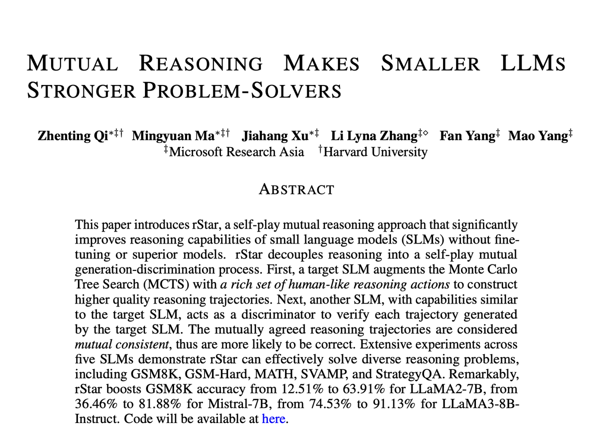 This paper introduces rStar, a self-play mutual reasoning approach that significantly improves reasoning capabilities of small language models (SLMs) without fine-tuning or superior models. rStar decouples reasoning into a self-play mutual generation-discrimination process. First, a target SLM augments the Monte Carlo Tree Search (MCTS) with a rich set of human-like reasoning actions to construct higher quality reasoning trajectories. Next, another SLM, with capabilities similar to the target SLM, acts as a discriminator to verify each trajectory generated by the target SLM. The mutually agreed reasoning trajectories are considered mutual consistent, thus are more likely to be correct. Extensive experiments across five SLMs demonstrate rStar can effectively solve diverse reasoning problems, including GSM8K, GSM-Hard, MATH, SVAMP, and StrategyQA. Remarkably, rStar boosts GSM8K accuracy from 12.51% to 63.91% for LLaMA2-7B, from 36.46% to 81.88% for Mistral-7B, from 74.53% to 91.13% for LLaMA3-8B-Instruct. Code will be available at GitHub - zhentingqi/rStar · GitHub.