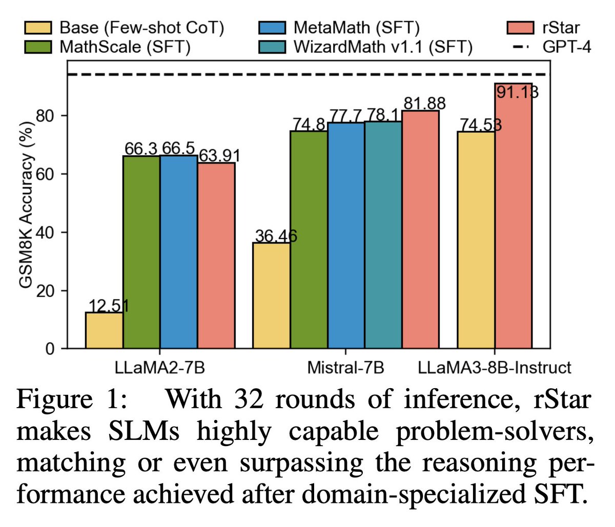 Introduces self-play mutual reasoning to improve the reasoning capabilities of small language models without fine-tuning or superior models; MCTS is augmented with human-like reasoning actions, obtained from SLMs, to build richer reasoning trajectories; a separate SLM provides unsupervised feedback on the trajectories and the target SLM selects the final reasoning trajectory as the answer; rStar boosts GSM8K accuracy from 12.51% to 63.91% for LLaMA2-7B and consistently improves the accuracy of other SLMs.