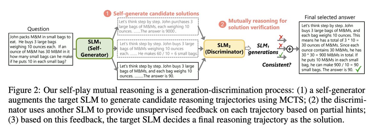 미세 조정이나 상위 모델 없이도 소규모 언어 모델의 추론 능력을 향상시키기 위해 셀프 플레이 상호 추론 도입, 보다 풍부한 추론 궤적을 구축하기 위해 SLM에서 얻은 인간과 유사한 추론 동작으로 MCTS를 증강, 별도의 SLM이 궤적에 대한 비지도 피드백을 제공하고 대상 SLM이 최종 추론 궤적을 답으로 선택, rStar는 LLaMA2-7B의 경우 GSM8K 정확도를 12.51%에서 63.91%로 높이고 다른 SLM의 정확도를 지속적으로 향상시킵니다.
