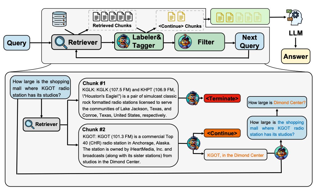 Trains an auto-encoder LM to label and tag chunks; it retrieves relevant chunks, tags them as either or , and annotates chunks for continuous processing; then a filter model is trained to formulate the next-hop query based on the original question and previous annotations; this is done iteratively until all chunks are tagged as or the maximum # of iterations is reached; after the process above has gathered enough information to answer the initial question, the final generator (an LLM) generates the final answer.