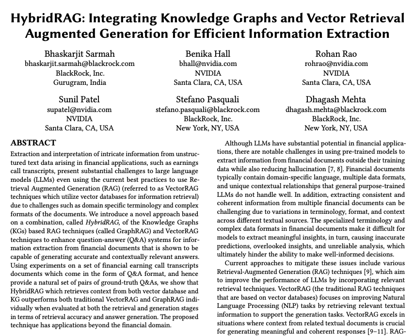 Combines GraphRAG and VectorRAG leading to a HybridRAG system that outperforms both individually; it was tested on a set of financial earning call transcripts. Combining the advantages of both approaches provides more accurate answers to queries.