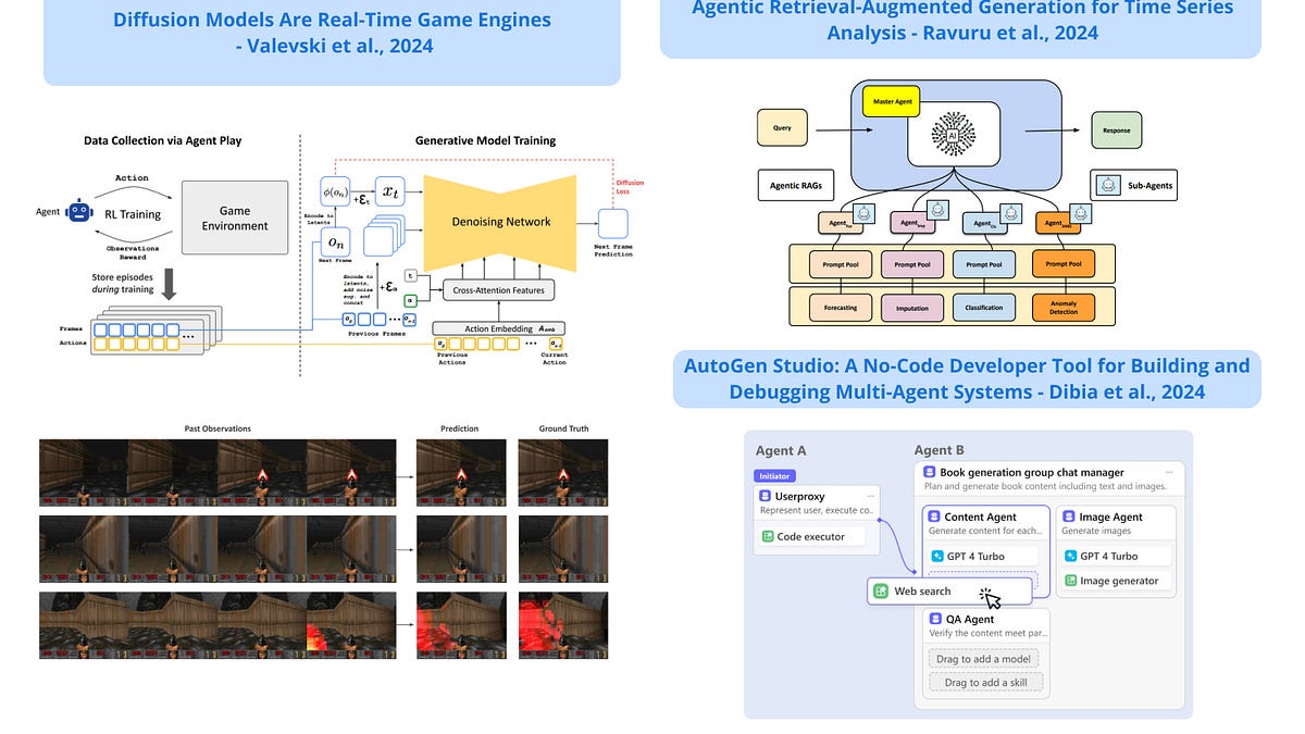 긴 궤적의 복잡한 환경과 실시간으로 상호작용할 수 있는 확산 모델 기반의 게임 엔진으로, RL 에이전트가 학습하고 확산 모델이 프레임을 생성하는 2단계 훈련 프로세스를 사용하며, 단일 TPU에서 20fps로 DOOM을 인터랙티브하게 시뮬레이션할 수 있습니다.