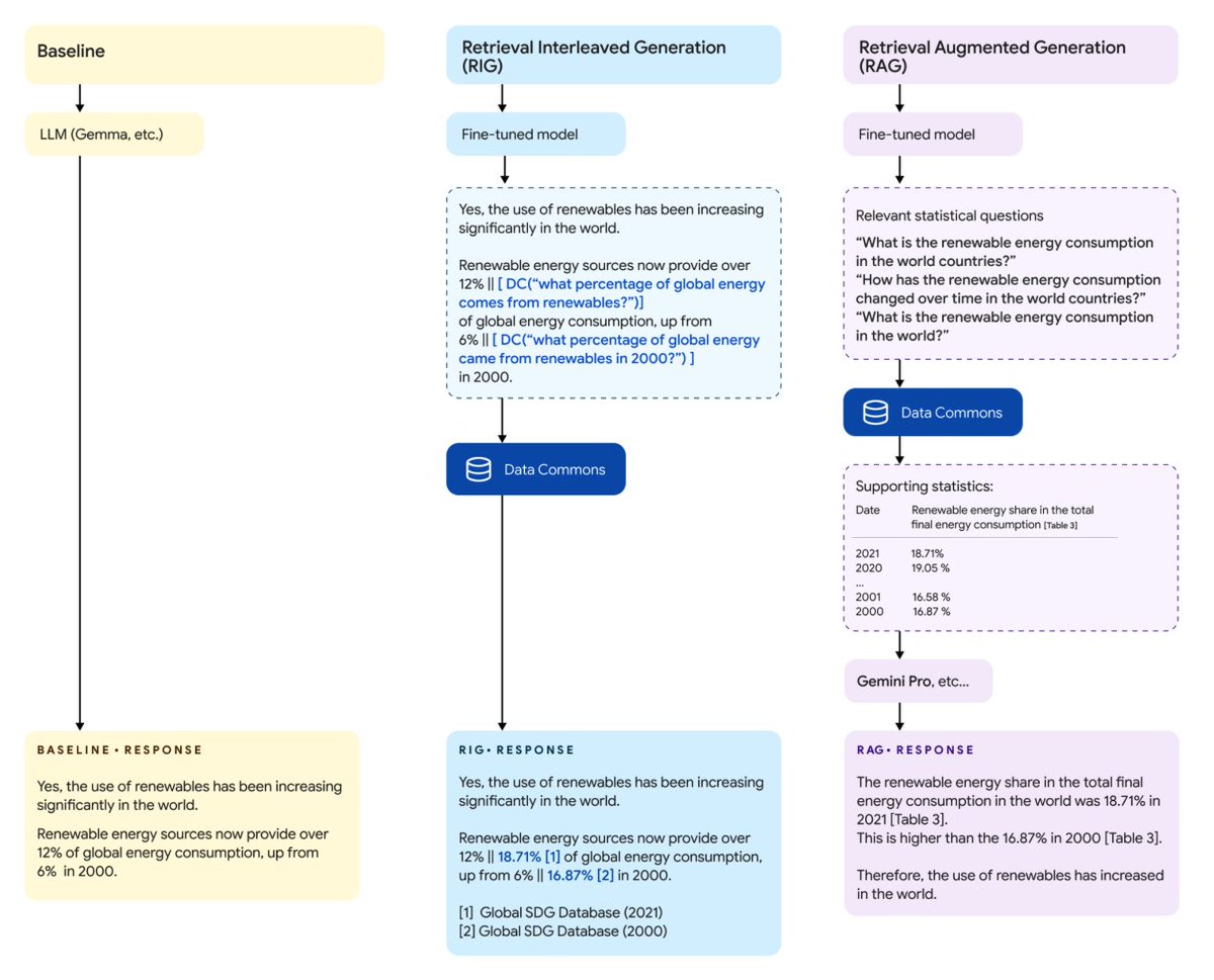 LLM이 수치 및 통계 데이터에 액세스하고 이를 통합할 수 있도록 미세 조정된 일련의 Gemma 2 모델 포함; 데이터 커먼즈의 공개 통계 데이터를 LLM 응답에 안정적으로 통합할 수 있는 검색 인터리브 생성(RIG)이라는 새로운 접근 방식 제안; RIG는 도구에서 영감을 얻은 접근 방식으로, 통계 토큰과 데이터 커먼즈의 검색에 적합한 자연어 질문을 인터리브할 수 있으며 이러한 기능을 얻기 위해 Gemini 1의 도움으로 생성된 명령-반응 데이터 세트에서 LLM을 미세 조정합니다.5; RIG 접근 방식은 사실성을 5~7%에서 약 58%로 향상시킵니다.