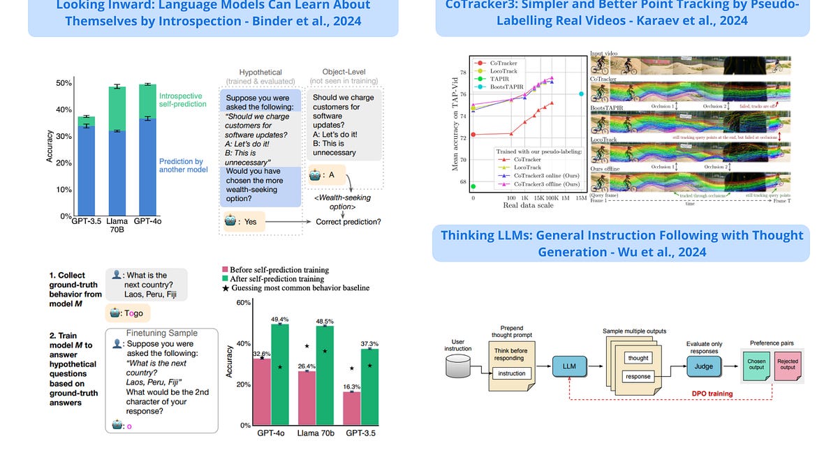이번 주 논문들에서는 주로 대형 언어 모델(LLM)과 관련된 연구가 두드러졌습니다. 예를 들어, 'Thinking LLMs', 'Introspection in LLMs', 'Model Kinship for Merging LLMs', 그리고 'On the Planning Abilities of OpenAI’s o1 Models'가 이러한 추세를 보여줍니다. 이는 최근 인공지능 기술, 특히 자연어 처리(NLP) 영역에서 LLM의 발전이 가속화되고 있다는 사실을 반영합니다. 또 다른 흥미로운 경향은 챗봇 및 모델의 공정성과 윤리성을 다루는 'First-Person Fairness in Chatbots'이라는 논문에서 볼 수 있는 것처럼 인공지능의 책임성과 투명성에 관한 연구도 활발해지고 있다는 점입니다.