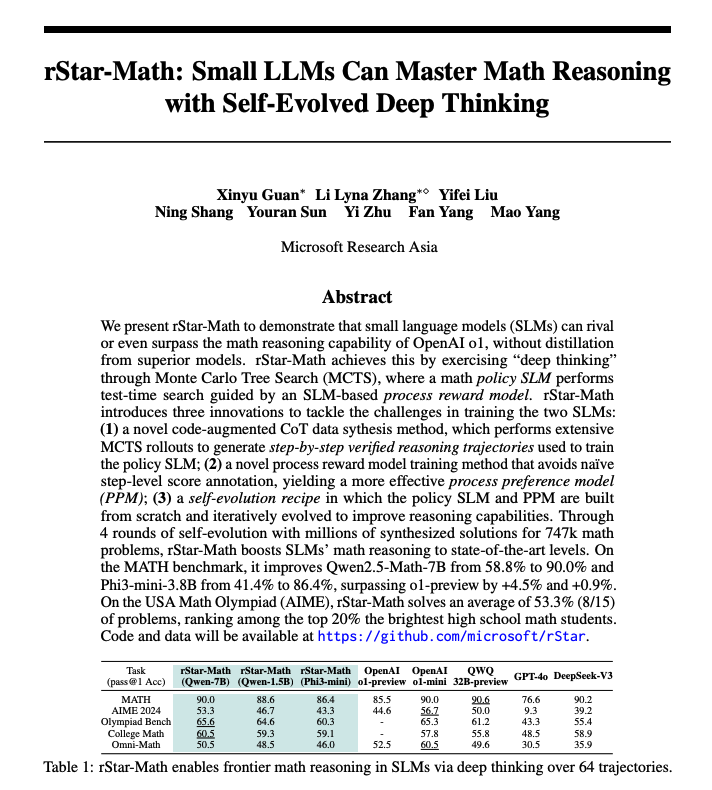 A new approach proposes three core components to enhance math reasoning: 1) a code-augmented CoT data synthesis method involving MCTS to generate step-by-step verified reasoning trajectories which are used to train the policy SLM, 2) an SLM-based process reward model that reliably predicts a reward label for each math reasoning step, and 3) a self-evolution recipe where the policy SLM and PPM are iteratively evolved to improve math reasoning; on the MATH benchmark, rStar-Math improves Qwen2.5-Math-7B from 58.8% to 90.0% and Phi3-mini-3.8B from 41.4% to 86.4%, surpassing o1-preview by +4.5% and +0.9%.