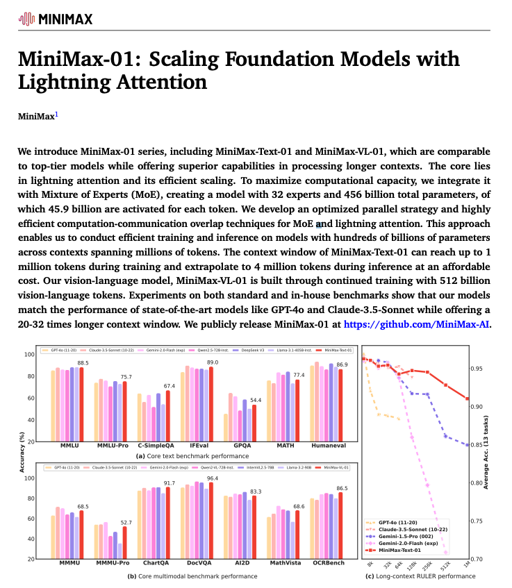 Introduces a new series of models that integrate Mixture-of-Experts; introduces a model with 32 experts and 456B parameters, and 45.9B are activated for each token; claims match the performance of state-of-the-art models like GPT-4o and Claude-3.5-Sonnet while offering a 20-32x longer context window; it can handle context windows of up to 4 million tokens; it integrates linear attention with optimized hardware utilization which enhances the efficiency and scalability of the LLM; there is also a vision model called MiniMax-VL-01 built through continued training with 512 billion vision-language tokens.