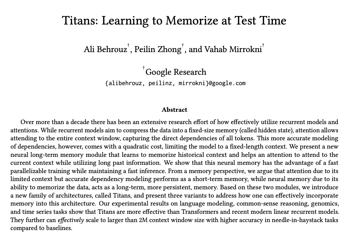 Introduces a neural long-term memory module to memorize historical context and help attention to attend to the current context while utilizing long past information; the neural memory module acts as a long-term, more persistent memory than just using attention alone (considered more short-term); Titan, which is based on neural memory, shows good results in language modeling, common-sense reasoning, genomics, and time series tasks.