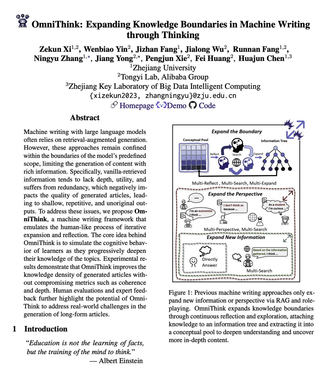 A new framework that emulates a human-like process of iterative expansion and reflection; it's built to simulate the cognitive behavior of learners as they deepen their knowledge; compared to RAG and role-playing, OmniThink can expand knowledge boundaries through continuous reflection and exploration; this makes it ideal for use cases that require long-form generation.