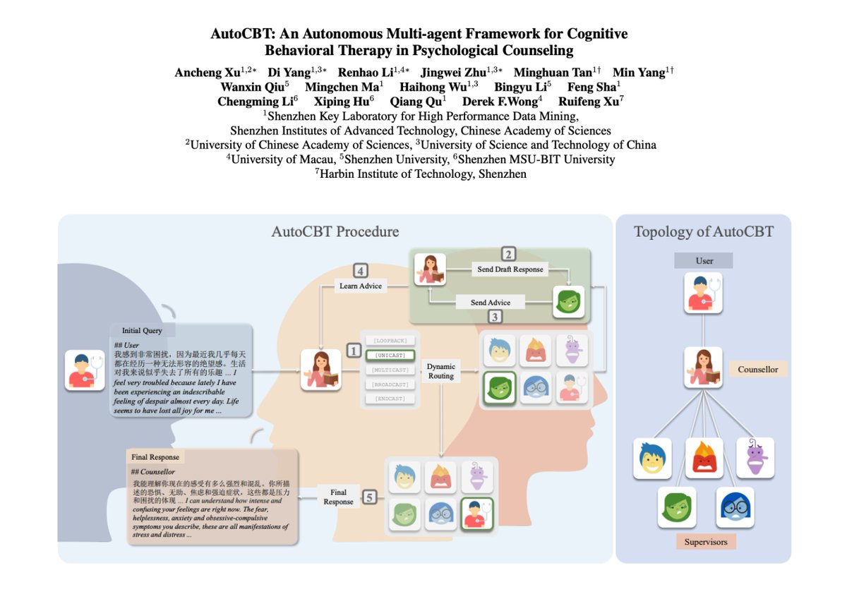 Proposes a multi-agent framework, AutoCBT, for Cognitive Behavioral Therapy; the work proposes a general multi-agent framework that generates high-quality responses for single-turn psychological consultation scenarios; it uses a combination of dynamic routing, memory, and supervisory mechanisms to enhance the autonomous ability of each agent; experimental results show that AutoCBT can provide higher-quality automated psychological counseling services; AutoCBT improves dialogue quality compared to other purely prompt-based counseling frameworks.