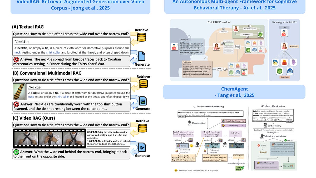비디오 콘텐츠를 외부 지식 소스로 활용하여 RAG를 향상시키는 프레임워크로, 주로 텍스트나 이미지에 중점을 두는 기존의 RAG 접근 방식과 달리 VideoRAG는 쿼리를 기반으로 관련 비디오를 동적으로 검색하고 시각적 요소와 텍스트 요소를 모두 생성 프로세스에 통합합니다; 이 프레임워크는 대규모 비디오 언어 모델(LVLM)을 사용하여 비디오 콘텐츠를 직접 처리함으로써 정적 양식에서는 전달하지 못하는 시간적 역동성, 공간적 세부 사항 및 멀티모달 단서를 보다 효과적으로 캡처할 수 있으며, 텍스트 설명이 없는 비디오의 경우 자동 음성 인식을 사용하여 트랜스크립트를 생성함으로써 시각 및 텍스트 양식을 모두 활용할 수 있도록 제안하고 있습니다.