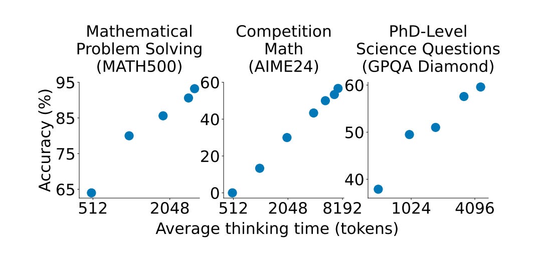 - “Budget forcing” for reasoning – A new decoding trick appends the token “Wait” when the model tries to stop, forcing it to think longer. This leads the model to double-check and fix its reasoning step. By also cutting off overly long reasoning, they control inference time.