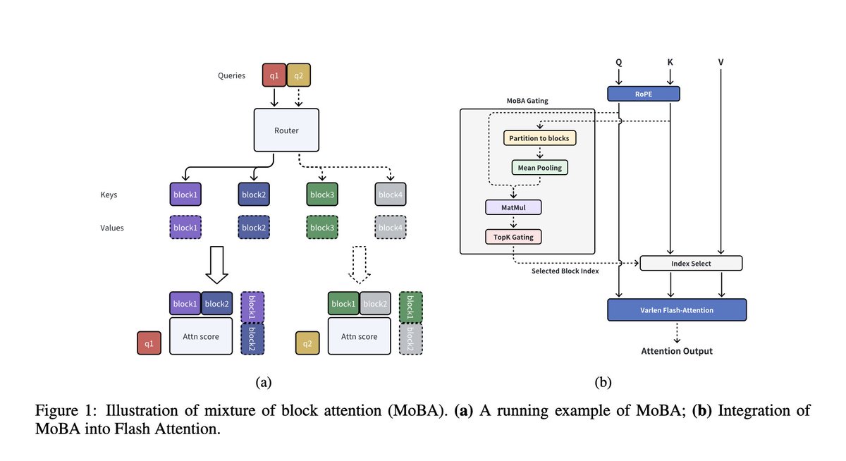 Adaptive Attention for Long Contexts– MoBA applies the Mixture of Experts (MoE) paradigm to the attention mechanism, allowing each query token to attend selectively to the most relevant key-value blocks rather than the full context. This enables models to handle extended sequences efficiently.