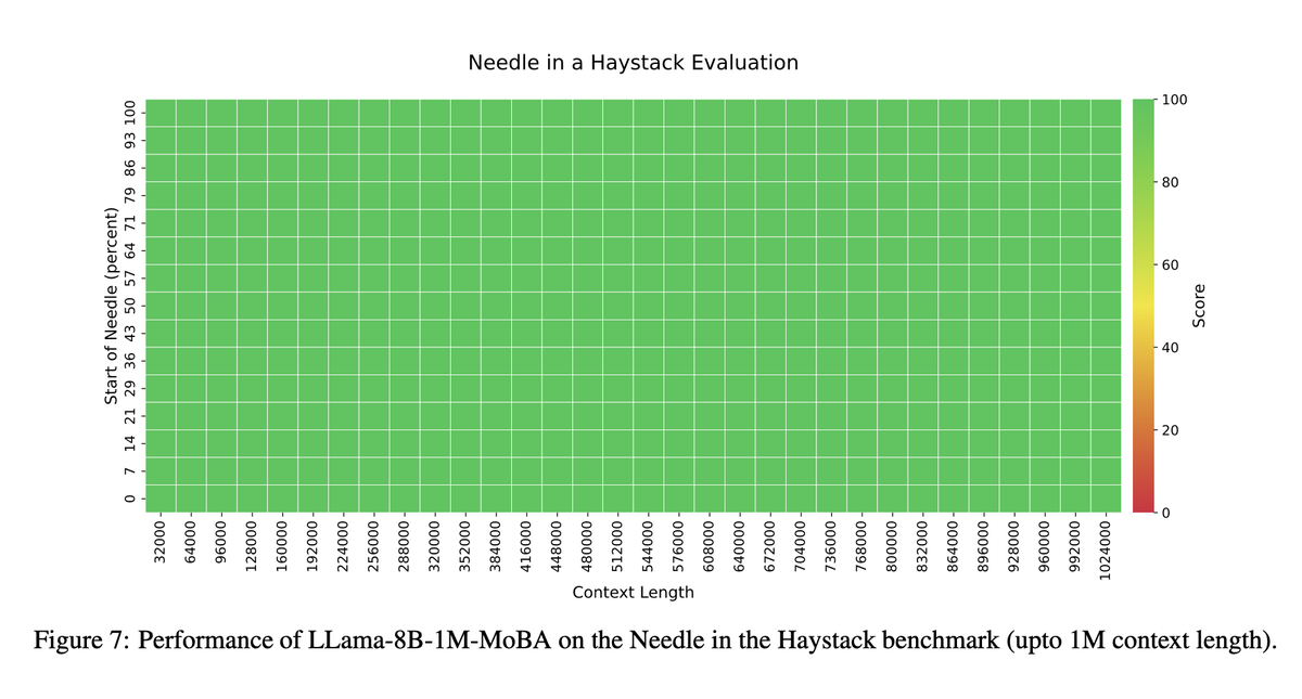 Comparable Performance to Full Attention– Extensive experiments show that MoBA achieves language modeling loss and benchmark performance nearly identical to full attention, even at high sparsity levels (~95.31%). It matches full attention in long-context benchmarks like Needle in a Haystack and RULER@128K.