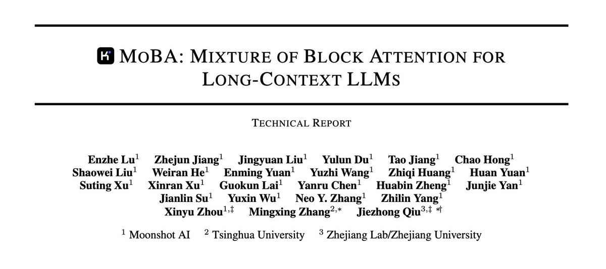 Scaling the effective context length is essential for advancing large language models (LLMs) toward artificial general intelligence (AGI). However, the quadratic increase in computational complexity inherent in traditional attention mechanisms presents a prohibitive overhead. Existing approaches either impose strongly biased structures, such as sink or window attention which are task-specific, or radically modify the attention mechanism into linear approximations, whose performance in com- plex reasoning tasks remains inadequately explored. In this work, we propose a solution that adheres to the “less structure” principle, allowing the model to determine where to attend autonomously, rather than introducing predefined biases. We intro- duce Mixture of Block Attention (MoBA), an innovative approach that applies the principles of Mixture of Experts (MoE) to the attention mechanism. This novel architecture demonstrates su- perior performance on long-context tasks while offering a key advantage: the ability to seamlessly transition between full and sparse attention, enhancing efficiency without the risk of compromising performance. MoBA has already been deployed to support Kimi’s long-context requests and demon- strates significant advancements in efficient attention computation for LLMs. Our code is available at GitHub - MoonshotAI/MoBA: MoBA: Mixture of Block Attention for Long-Context LLMs · GitHub