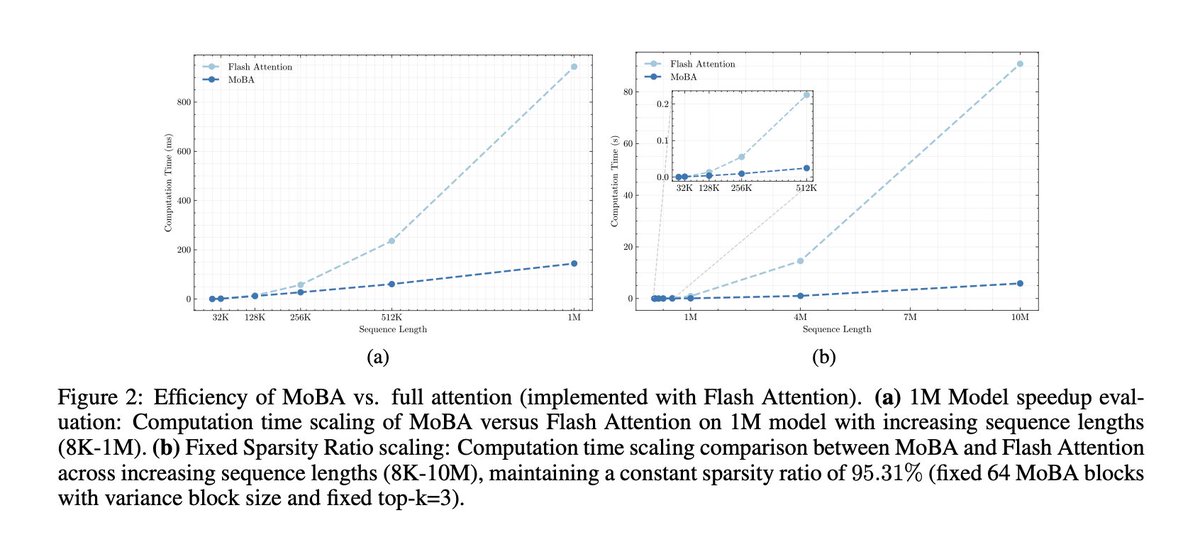 Seamless Transition Between Full and Sparse Attention– Unlike static sparse attention methods like sliding window or sink attention, MoBA can dynamically switch between full and sparse attention modes, ensuring adaptability without sacrificing generalization.