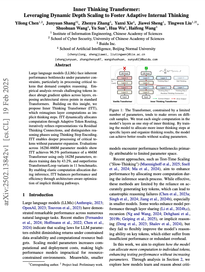 내적 사고 트랜스포머(ITT): 동적 뎁스 스케일링을 활용하여 적응형 내적 사고 촉진하기 / Inner Thinking Transformer: Leveraging Dynamic Depth Scaling to Foster Adaptive Internal Thinking