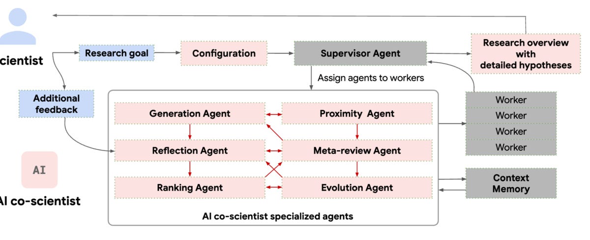 Hierarchical Multi-Agent System– AI co-scientist is built with a Supervisor agent that assigns tasks to specialized agents. Apparently, this architecture helps with scaling compute and iteratively improving scientific reasoning.