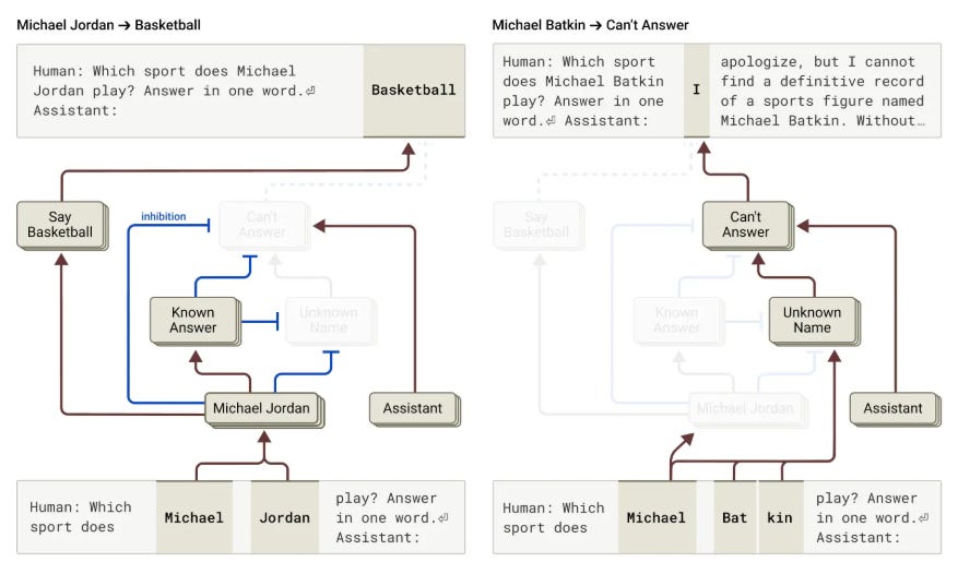 환각 및 거부 - 이 모델은 알려진 개념으로 프롬프트되지 않는 한 기본적으로 거부로 설정됩니다. "알려진 답"에 대한 회로가 잘못 작동하면 환각을 일으킵니다(예: '마이클 배트킨'과 같은 가짜 이름에 대한 사실을 지어내는 것). 연구자들은 기능 활성화를 조작하여 이 동작을 전환할 수 있습니다.