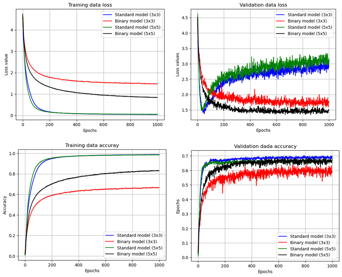 이진 정규화 레이어는 완전 연결, 컨볼루션, 어텐션 등 다양한 신경망 아키텍처에 적용 가능하며, 훈련 과정에서 전체 정밀도 32비트 값과 이진화된 값의 두 가지 형태를 사용하여 안정적인 학습을 보장한다. 이 연구에서는 다중 클래스 이미지 분류와 언어 디코딩 문제를 해결하기 위해 이진 정규화 레이어를 활용한 두 가지 모델을 구성하였다. 실험 결과, 이 모델들은 기존의 32비트 매개변수를 사용하는 모델과 거의 동일한 성능을 보이며, 메모리 사용량은 32배 감소하였다.