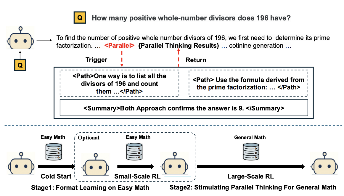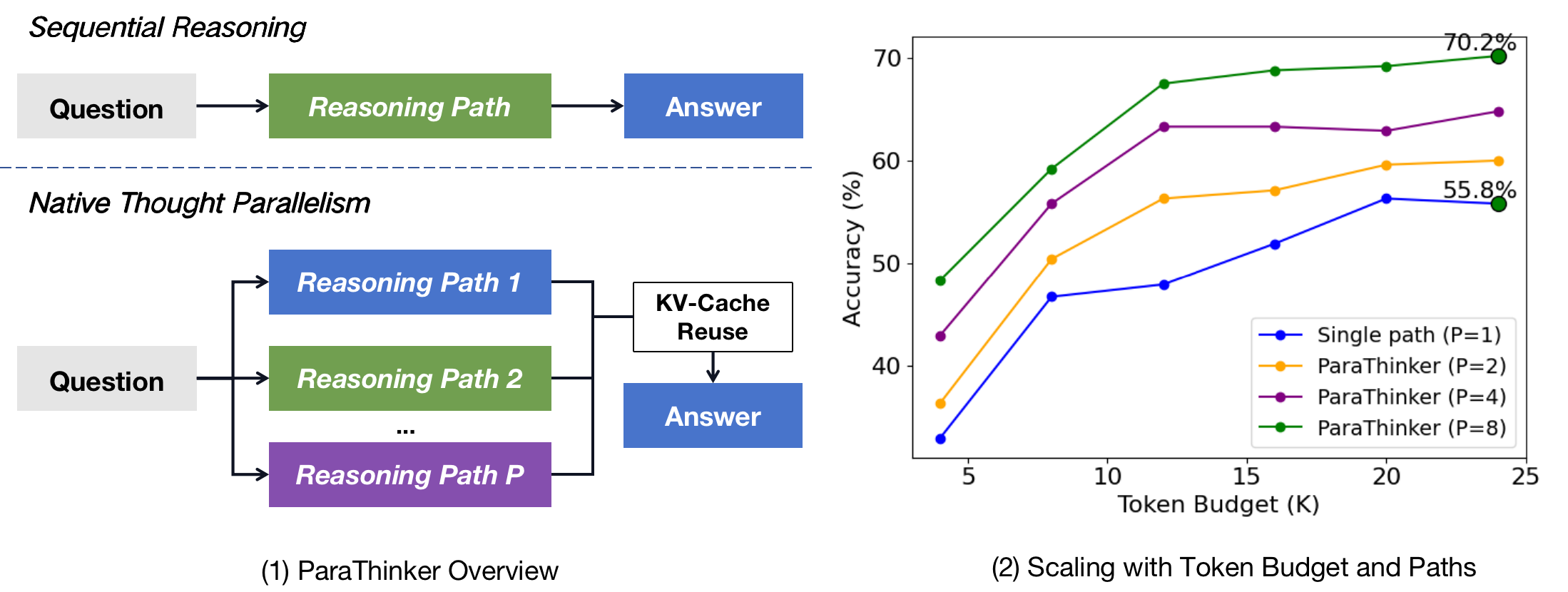 병렬 사고 및 강화학습의 통합: Parallel-R1과 ParaThinker와 같은 연구들은 대규모 언어 모델(LLM)의 사고 능력을 향상시키기 위해 병렬 사고를 활용하는 방법을 제안합니다. 이들은 강화학습(RL)을 통해 복잡한 문제를 해결하는 데 필요한 다양한 사고 경로를 동시에 탐색하여 성능을 개선합니다. 이러한 방식은 기존의 순차적 사고 모델에 비해 더 높은 정확도를 달성하는 데 기여하고 있습니다.