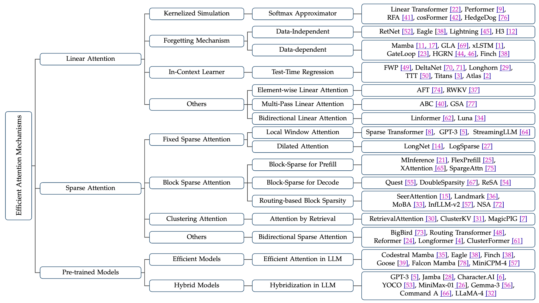 트랜스포머 기반 구조는 대형 언어 모델의 핵심이지만, 자기-어텐션(self-attention)의 이차 시간 및 메모리 복잡도가 긴 문맥 처리에 큰 제약이 됩니다. 이를 해결하기 위해 최근 연구에서는 커널 근사, 순환 구조, 패스트웨이트 역학을 활용한 선형 어텐션(linear attention)과, 고정 패턴, 블록 단위 라우팅, 클러스터링을 통한 희소 어텐션(sparse attention) 두 가지 주요 효율적 어텐션 기법이 제안되었습니다. 본 서베이 논문에서는 알고리즘적 혁신과 하드웨어 관점 모두를 통합하여 이러한 방법들을 체계적으로 정리하고, 효율적 어텐션을 적용한 대규모 사전학습 언어 모델의 다양한 설계 방식을 분석합니다. 이로써 확장 가능하고 효율적인 언어 모델 설계에 대한 이론과 실무 전략을 연결하는 기초 자료를 제공합니다.