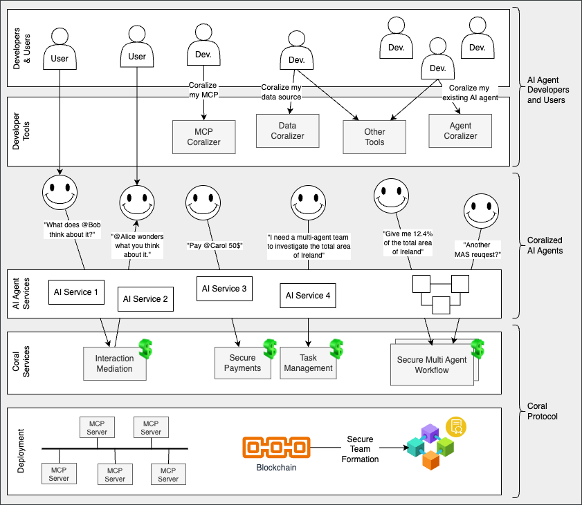 Coral Protocol은 개방적이고 분산된 협력 인프라로, 다양한 AI 에이전트 간의 통신, 조정, 신뢰 및 결제를 가능하게 한다. 이 프로토콜은 여러 전문 AI 에이전트를 배포하는 조직들이 서로 다른 도메인과 공급업체 간에 협력할 수 있도록 하는 상호 운용성의 필요성을 해결하고자 한다. Coral은 다중 에이전트 AI 생태계를 위한 기본 플랫폼으로서, 모든 에이전트가 복잡한 워크플로우에 참여할 수 있도록 공통 언어와 조정 프레임워크를 구축한다. 이 설계는 광범위한 호환성, 보안 및 공급업체 중립성을 강조하여, 에이전트 간의 상호작용이 효율적이고 신뢰할 수 있도록 한다.