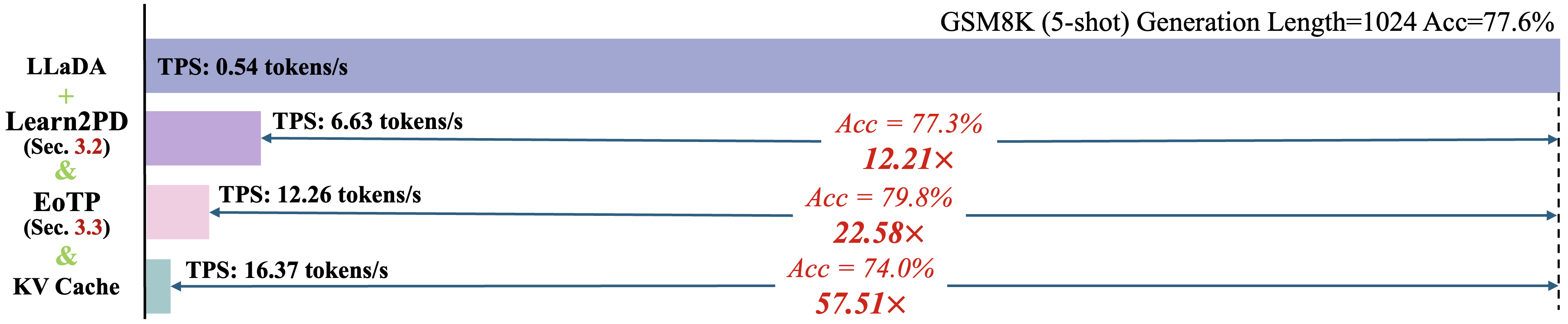 또한, 연구에서는 'End-of-Text Prediction (EoTP)' 기법을 도입하여 시퀀스의 끝에서 디코딩 완료를 감지함으로써 패딩 토큰의 중복 디코딩을 방지하는 방법을 제시한다. 실험 결과, 제안된 방법은 LLaDA 벤치마크에서 성능 저하 없이 최대 22.58배의 속도 향상을 달성하며, KV-Cache와 결합할 경우 최대 57.51배의 속도 향상을 보여준다. 이러한 성과는 LLM의 디코딩 효율성을 크게 향상시키며, 디퓨전 모델의 활용 가능성을 넓히는 중요한 기여로 평가된다.
