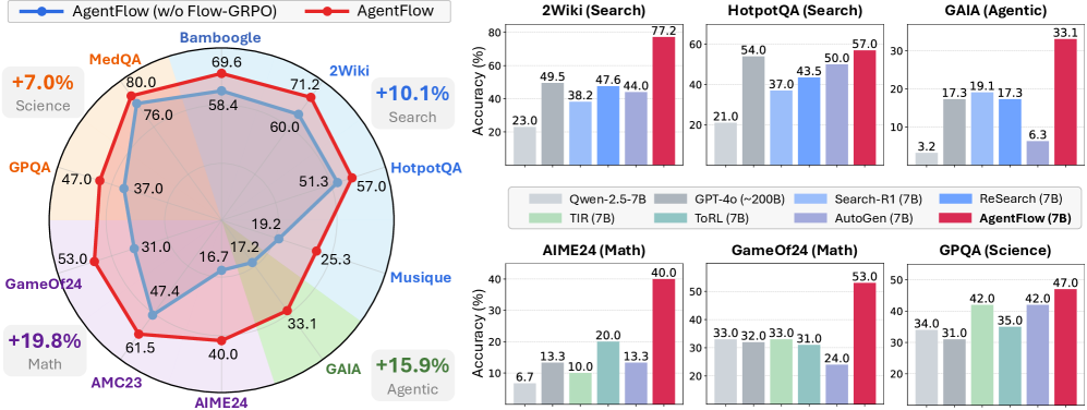 AgentFlow는 10개의 벤치마크에서 평가되었으며, 7B 규모의 백본을 활용하여 기존의 최상위 모델들을 초월하는 성과를 보여주었습니다. 평균적으로 검색, 에이전틱, 수학적, 과학적 작업에서 각각 14.9%, 14.0%, 14.5%, 4.1%의 정확도 향상을 달성하였으며, 이는 GPT-4o와 같은 대형 모델을 초과하는 결과입니다. 이러한 성과는 인-더-플로우 최적화의 중요성을 강조하며, 계획, 도구 호출 신뢰성, 모델 크기 및 추론 턴에 대한 긍정적인 확장을 보여줍니다. AgentFlow의 접근 방식은 기존의 도구 통합 강화학습 방법에 비해 더 효과적이며, 실시간 환경에서의 학습과 적응을 가능하게 합니다.