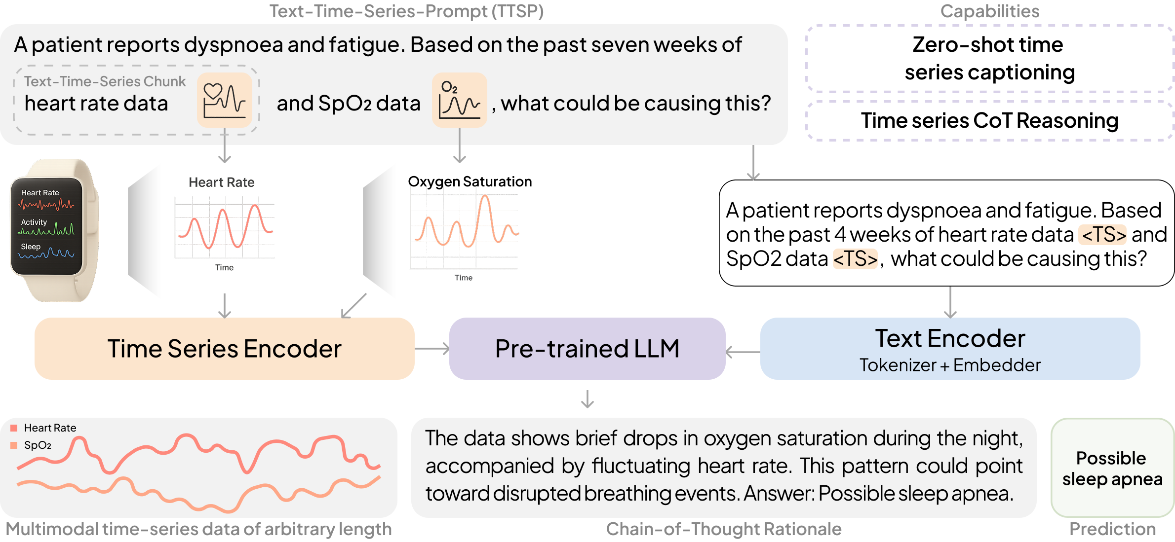 OpenTSLM(Time Series Language Model)은 다변량 의료 텍스트 및 시간 시계열 데이터에 대한 추론을 가능하게 하는 혁신적인 모델로, 기존의 대규모 언어 모델(LLM)의 한계를 극복하기 위해 개발되었습니다. LLM은 멀티모달 데이터를 해석하는 데 강력한 도구로 자리잡았지만, 시간 시계열 데이터를 효과적으로 처리하는 데는 부족함이 있었습니다. OpenTSLM은 이러한 필요를 충족하기 위해 사전 학습된 LLM에 시간 시계열을 기본 모달리티로 통합하여, 다양한 길이의 시간 시계열을 처리할 수 있도록 설계되었습니다.