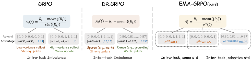 OneThinker는 다중 작업 강화 학습에서 보상 이질성을 처리하기 위해 EMA-GRPO(Exponential Moving Average - Generalized Reward Policy Optimization) 기법을 도입하여, 작업별 보상 표준 편차의 이동 평균을 추적함으로써 균형 잡힌 최적화를 달성합니다. 이 방법론은 특정 작업 간의 효과적인 지식 전이를 가능하게 하여, 다양한 시각 추론 벤치마크에서 강력한 성능을 발휘하게 합니다.