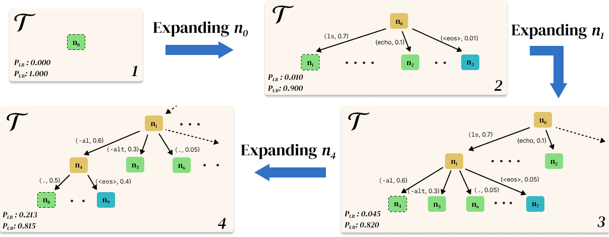BEAVER는 모든 접두사 닫힌 의미적 제약 조건에 대해 새로운 토큰 트라이(token trie)와 프론티어(frontier) 데이터 구조를 활용하여 생성 공간을 체계적으로 탐색합니다. 이 과정에서 각 반복마다 증명 가능한 신뢰 경계를 유지하며, 검증 문제를 형식화하고 접근 방식의 신뢰성을 이론적으로 증명합니다. BEAVER의 알고리즘은 입력된 제약 조건을 분석하고, 가능한 출력 조합을 탐색하며, 각 조합에 대한 신뢰 경계를 계산하는 단계로 구성되어 있습니다.