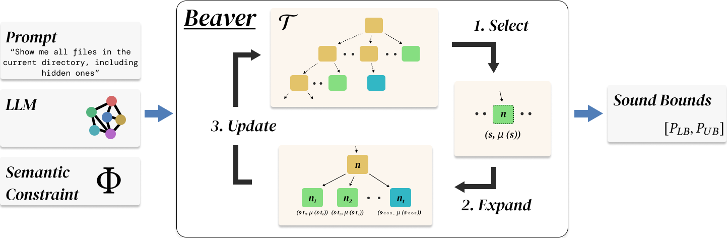 대규모 언어 모델(LLM)이 연구 프로토타입에서 생산 시스템으로 전환됨에 따라, 실무자들은 모델 출력이 요구되는 제약 조건을 만족하는지 검증할 수 있는 신뢰할 수 있는 방법이 필요합니다. 샘플링 기반 추정치는 모델 행동에 대한 직관을 제공하지만, 확실한 보장을 제공하지는 않습니다. 우리는 LLM 제약 만족에 대한 결정론적이고 신뢰할 수 있는 확률 경계를 계산하기 위한 첫 번째 실용적인 프레임워크인 BEAVER를 제시합니다. BEAVER는 모든 접두사 닫힌 의미적 제약에 대해 새로운 토큰 트라이 및 프론티어 데이터 구조를 사용하여 생성 공간을 체계적으로 탐색하며, 매 반복마다 증명 가능한 신뢰 경계를 유지합니다. 우리는 검증 문제를 형식화하고, 우리의 접근 방식의 신뢰성을 증명하며, 여러 최첨단 LLM에 걸쳐 정확성 검증, 프라이버시 검증 및 안전한 코드 생성 작업에서 BEAVER를 평가합니다. BEAVER는 동일한 계산 예산 하에서 기준 방법에 비해 6배에서 8배 더 엄격한 확률 경계를 달성하고, 3배에서 4배 더 많은 고위험 사례를 식별하여 느슨한 경계나 경험적 평가가 제공할 수 없는 정밀한 특성화 및 위험 평가를 가능하게 합니다.