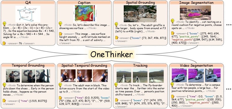 이러한 연구는 멀티모달 추론 일반화 모델로서의 잠재력을 보여주며, 다양한 시각 작업 간의 지식 공유를 통해 확장 가능하고 일반화 가능한 시각 추론의 가능성을 제시합니다. OneThinker의 모든 코드, 모델 및 데이터는 공개되어, 향후 연구자들이 이 모델을 활용하여 더욱 발전된 멀티모달 이해 시스템을 개발할 수 있는 기회를 제공합니다.