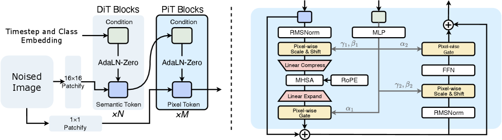 이 모델은 두 가지 수준의 트랜스포머 아키텍처를 채택하여 글로벌 의미를 포착하는 패치 수준의 DiT와 텍스처 세부 사항을 정제하는 픽셀 수준의 DiT로 구성됩니다. 이러한 이중 수준 디자인은 픽셀 공간에서의 디퓨전 모델을 효율적으로 학습하면서도 세부 사항을 보존할 수 있도록 합니다. 특히, 픽셀 수준의 토큰 모델링이 PixelDiT의 성공에 필수적이라는 분석 결과가 도출되었습니다.