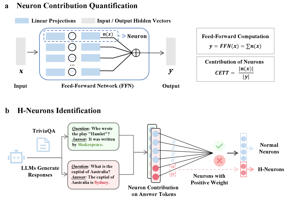 H-뉴런: 대규모 언어 모델에서 환각 관련 뉴런의 존재, 영향 및 기원에 대한 연구 / H-Neurons: On the Existence, Impact, and Origin of Hallucination-Associated Neurons in LLMs