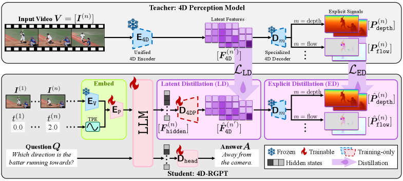 다양한 멀티모달 대규모 언어 모델(MLLM)의 발전에도 불구하고, 3D 구조와 시간적 동역학에 대한 추론 능력은 여전히 제한적이며, 이는 약한 4D 인식과 시간적 이해에 의해 제약받고 있습니다. 기존의 3D 및 4D 비디오 질문 응답(VQA) 벤치마크는 정적인 장면에 중점을 두고 있으며, 지역 수준의 프롬프트가 부족합니다. 우리는 다음과 같은 문제를 해결하기 위해 다음을 도입합니다: (a) 향상된 시간적 인식을 통해 비디오 입력에서 4D 표현을 캡처하도록 설계된 전문화된 MLLM인 4D-RGPT; (b) 고정된 전문가 모델에서 4D 표현을 4D-RGPT로 전이하여 포괄적인 4D 인식을 위한 훈련 프레임워크인 지각적 4D 증류(P4D); (c) 지역 수준의 프롬프트를 갖춘 깊이 인식 동적 장면을 위한 벤치마크인 R4D-Bench로, 하이브리드 자동화 및 인간 검증 파이프라인을 통해 구축되었습니다. 우리의 4D-RGPT는 기존의 4D VQA 벤치마크와 제안된 R4D-Bench 벤치마크 모두에서 주목할 만한 개선을 달성했습니다.