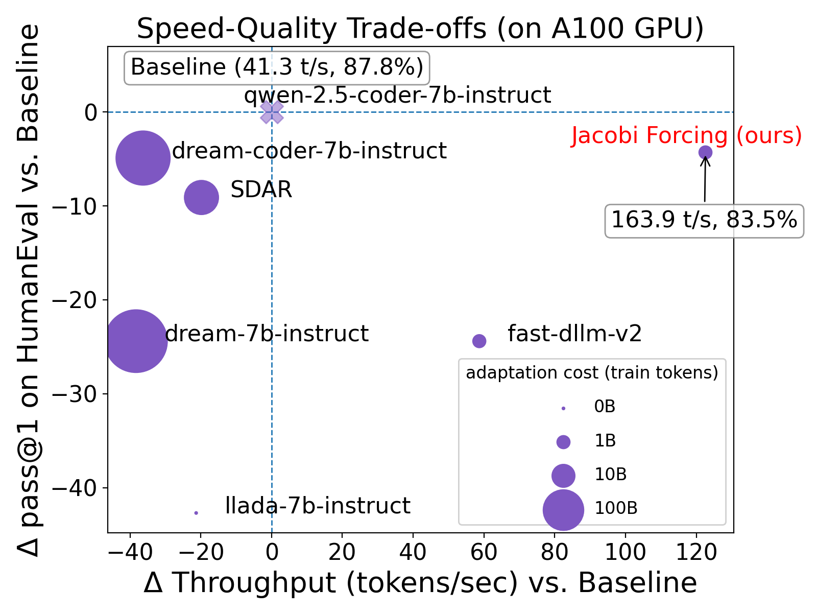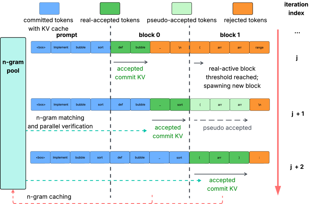 대규모 언어 모델의 추론 속도를 향상시키기 위한 연구가 활발히 진행되고 있는 가운데, 본 연구는 자코비 포싱(Jacobi Forcing)이라는 혁신적인 방법론을 제안한다. 이 방법론은 다중 토큰 생성을 통해 트랜스포머 기반 모델의 병렬 디코딩을 가능하게 하여, 추론 지연을 최소화하는 데 초점을 맞춘다. 기존의 디퓨전 대규모 언어 모델(dLLMs) 접근 방식은 사전학습(pre-training)과 사후학습(post-training) 간의 불일치로 인해 성능 향상에 한계를 보였다. 특히, dLLMs는 양방향 어텐션을 사용하여 인과적 사전(causal prior)과의 충돌을 야기하며, 이는 정확한 키-값 캐시(KV cache) 재사용을 방해한다.