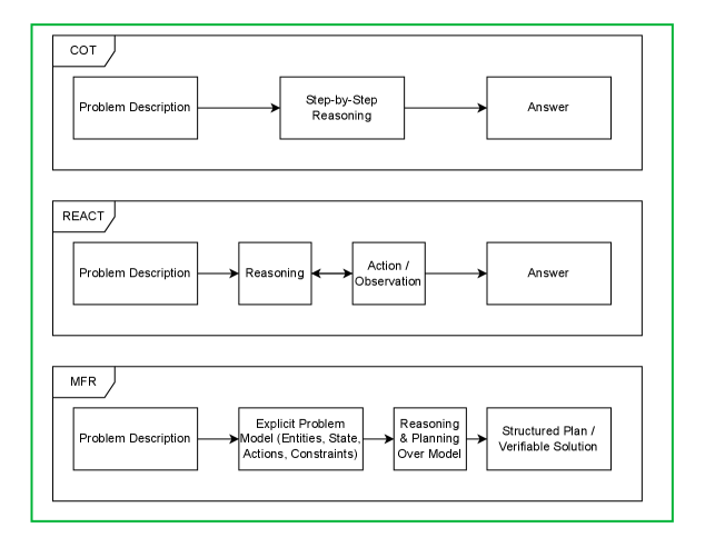 MFR은 문제의 명시적인 모델을 구성하는 단계와 솔루션을 생성하는 단계로 나뉘며, 이 과정에서 엔티티, 상태 변수, 행동 및 제약을 정의한다. 이러한 명시적인 모델링은 LLM이 보다 구조화된 방식으로 문제를 이해하고 해결할 수 있도록 돕는다. 본 연구는 LLM 기반 계획 및 추론 작업에서의 표현 실패를 해결하기 위한 기초를 제공하며, 신뢰할 수 있는 AI 에이전트를 위한 중요한 기여를 한다. 모든 프롬프트, 평가 절차 및 작업 데이터셋이 문서화되어 재현성을 촉진하고, 향후 연구에 대한 기초를 마련한다.