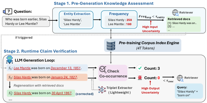 QuCo-RAG의 불확실성 정량화는 두 가지 주요 단계로 구성된다. 첫 번째 단계에서는 생성 전에 긴 꼬리 지식 격차를 나타내는 저빈도 엔티티를 식별한다. 두 번째 단계에서는 생성 중에 사전 학습 데이터에서 엔티티의 동시 발생을 검증하여, 동시 발생이 0일 경우 허위 정보의 위험을 신호한다. 이러한 두 단계는 Infini-gram을 활용하여 4조 개의 토큰에 대해 밀리초 지연 쿼리를 수행함으로써 불확실성이 높은 상황에서 검색을 트리거한다.