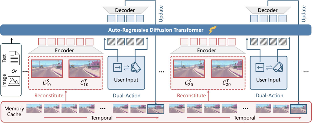 WorldPlay는 실시간 상호작용 세계 모델링을 위한 혁신적인 스트리밍 비디오 디퓨전 모델로, 장기 기하학적 일관성을 유지하면서도 속도와 메모리 간의 트레이드오프를 해결하는 데 중점을 두고 개발되었습니다. 이 모델은 세 가지 주요 혁신을 통해 성능을 극대화합니다. 첫째, Dual Action Representation을 통해 사용자의 입력에 대한 강력한 동작 제어를 가능하게 하여, 다양한 스케일의 장면에서 물리적으로 그럴듯한 움직임을 구현합니다. 둘째, Reconstituted Context Memory는 과거 프레임의 정보를 동적으로 재구성하여 장기 일관성을 유지하는 데 기여합니다. 이를 통해 기하학적으로 중요한 오래된 프레임을 접근 가능하게 하여 메모리 효율성을 높입니다. 셋째, Context Forcing이라는 새로운 증류 방법을 도입하여 메모리 인식 모델의 성능을 향상시킵니다. 이 방법은 교사와 학생 모델 간의 메모리 컨텍스트를 정렬하여 학생 모델이 장기 정보를 효과적으로 활용할 수 있도록 지원합니다.