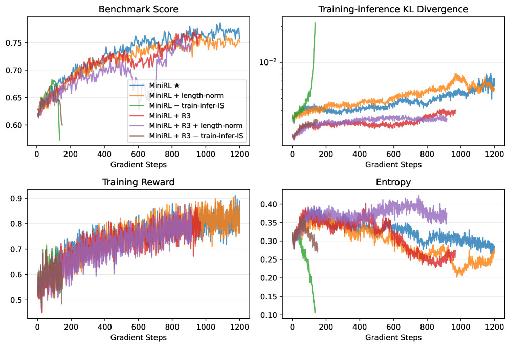 이러한 통찰력은 중요도 샘플링 보정, 클리핑, 그리고 Mixture-of-Experts (MoE) 모델을 위한 Routing Replay와 같은 기술들이 RL 훈련의 안정화에 미치는 영향을 설명하는 데 기여합니다. 30B MoE 모델을 사용한 수백만 GPU 시간에 걸친 실험을 통해, 온-정책 훈련에서 중요도 샘플링 보정을 포함한 기본 정책 그래디언트 알고리즘이 가장 높은 훈련 안정성을 달성함을 입증하였습니다. 또한, 오프-정책 업데이트를 도입하여 수렴을 가속화할 때, 클리핑과 Routing Replay의 결합이 정책의 노후화로 인한 불안정을 완화하는 데 필수적임을 강조합니다.
